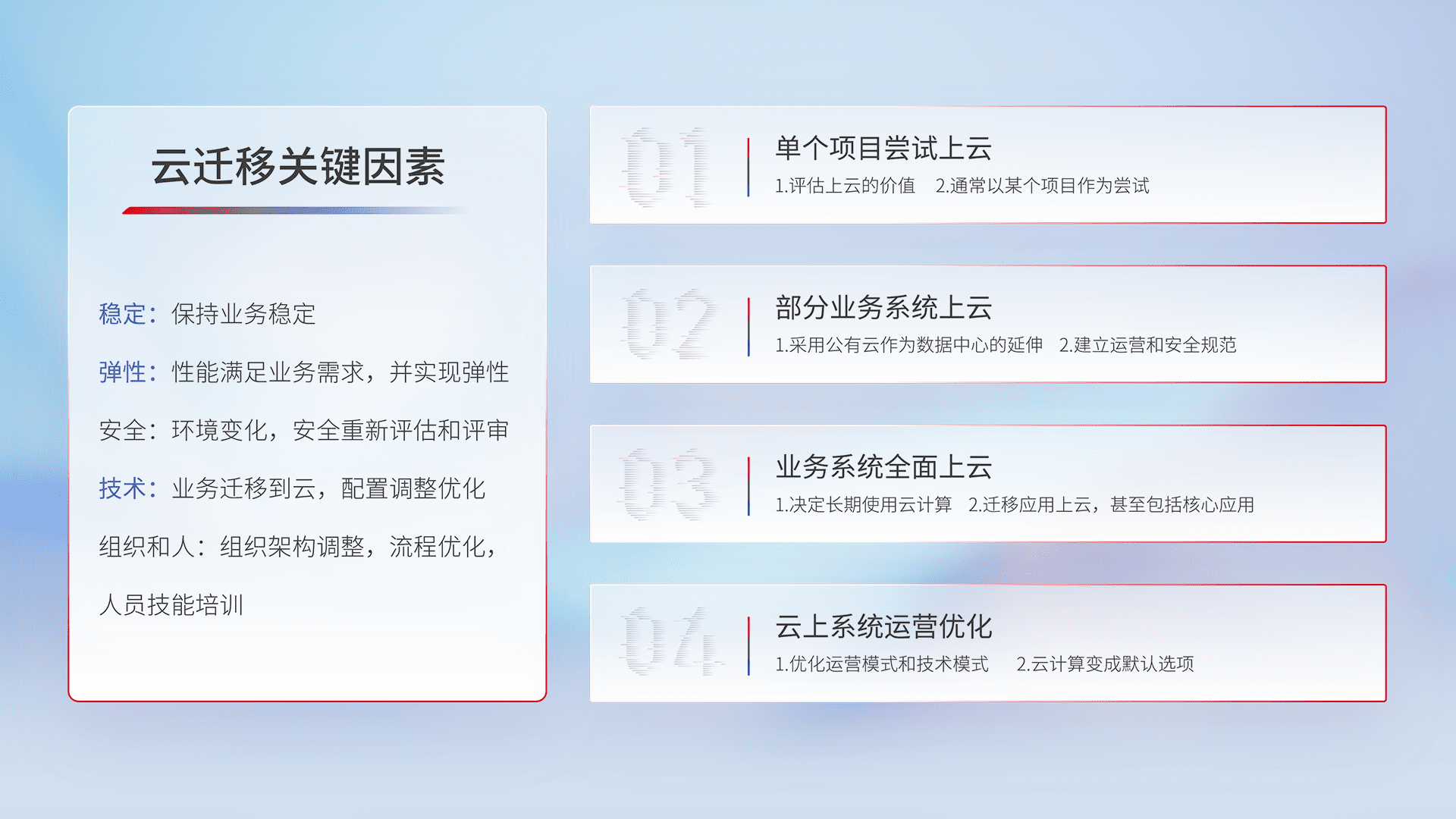 结合实际业务,,从规划设计、、云平台选型、、、云原生改造、、数据迁移、、、集成交付,,,迁移全过程为客户识别最佳上云路径,,做好风险识别管理,,,,设计网络架构、、、身份权限、、、、安全审计合规、、、、操作审计、、日志审计、、、监控告警策略、、、多站点容灾设计等,,对云上基础设施进行整体规划,,,,提升IT治理水平,,以满足弹性、、、、高可用、、、、高性能的需求。。。