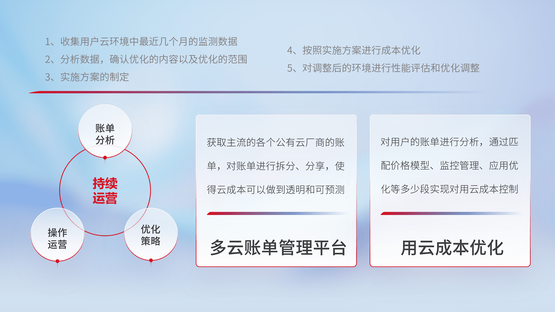 通过多云纳管,,以统一的资源数据模型把客户的云资源进行抽象和封装,,,,进而实现对多云资源的统一操作,,,,保障云资源管理的可靠性、、、、稳定性与可用性。。。量身定制化运维内容,,,,配置、、、开发运维、、、补丁管理、、、备份、、监控、、、认证和访问管理、、审计和日常巡检等,,,保障在用云过程中的可靠度,,稳定度以及高可用率。。